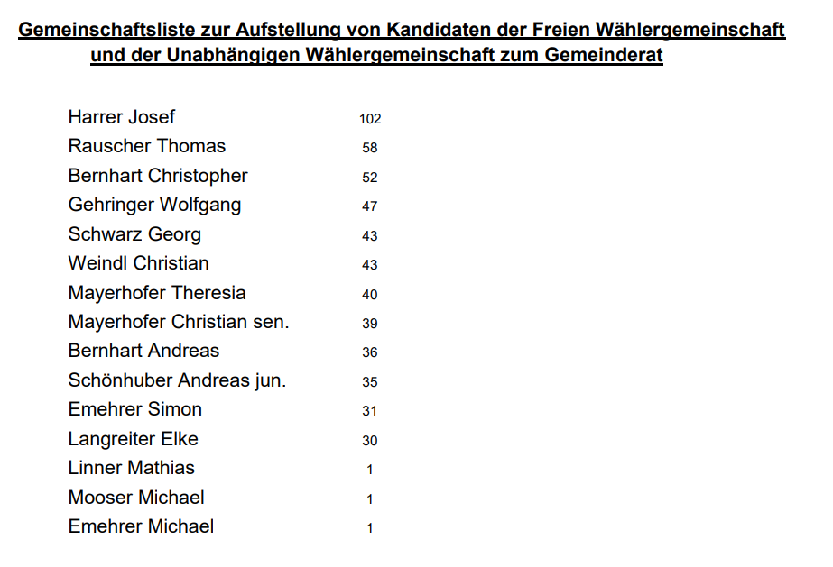 Bei der Aufstellungsversammlung der Kandidaten der Freien Wählergemeinschaft und der Unabhängigen Wählergemeinschaft zum Bürgermeister und Gemeinderat gab es folgendes Ergebnis: