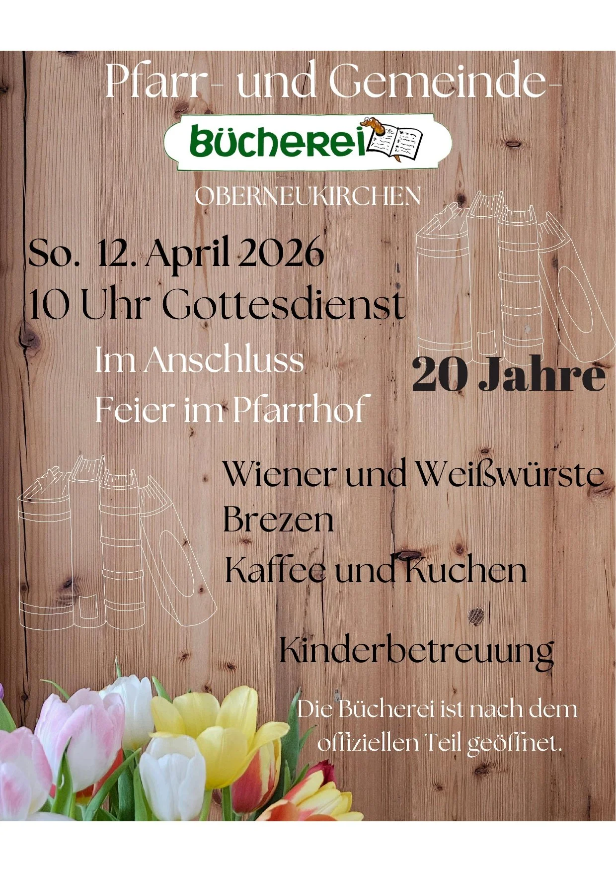 Die Bücherei kann am kommenden Sonntag, 12.4.26 das 20-jährige Bestehen feiern Herzliche Einladung für Sonntag nach dem Gottesdienst um 10 Uhr - gefeiert wird im Pfarrhof mit Wiener, Weißwürst und Brezen usw.