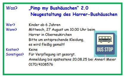 Zurück zu allen Events Ferienprogramm: “Pimp my Bushäuschen” 2.0 Mittwoch, 27. August 2025 10:00 15:00 Google Kalender ICS